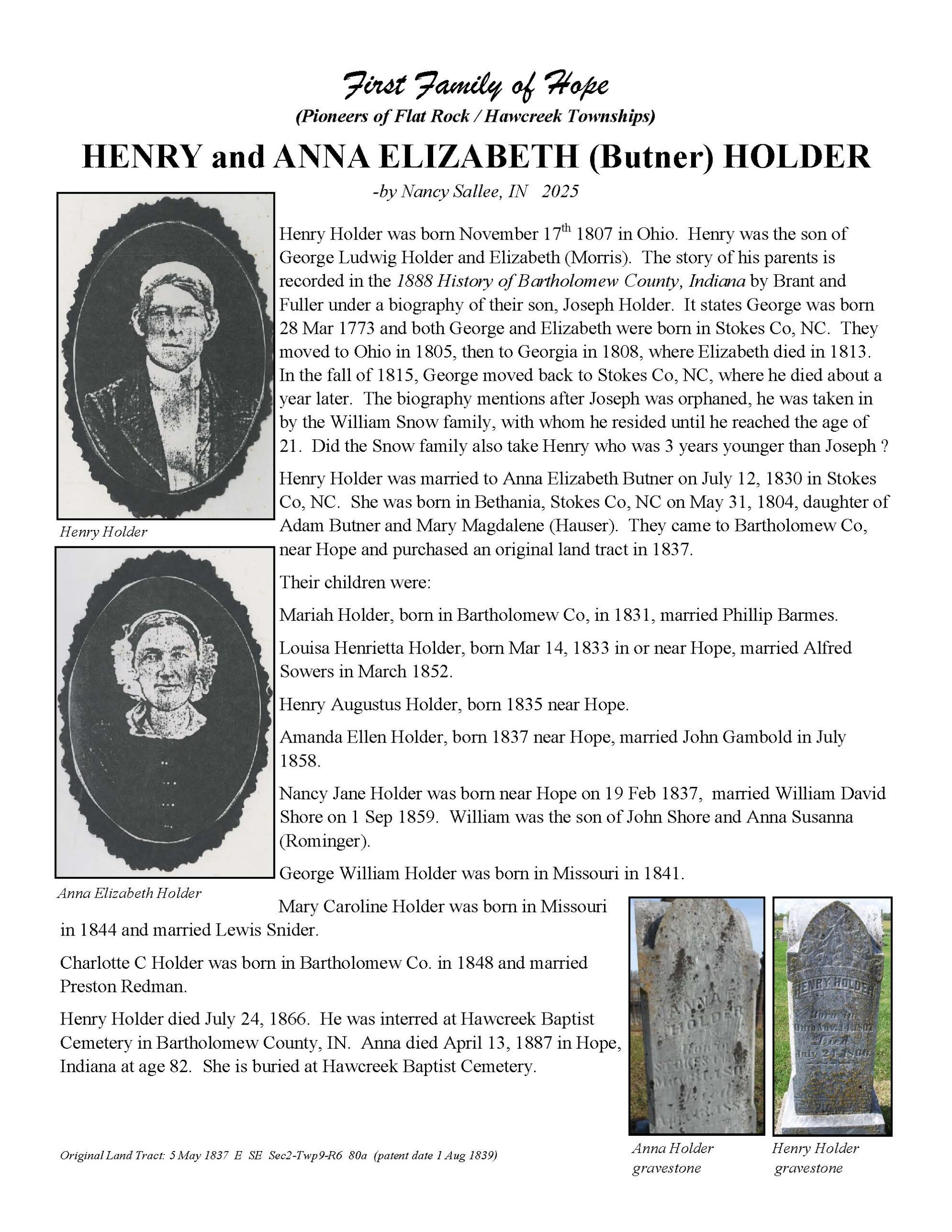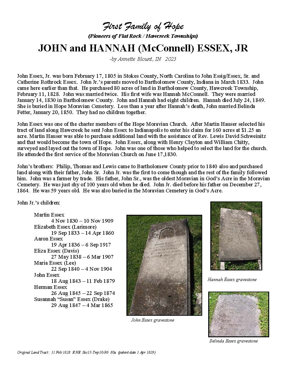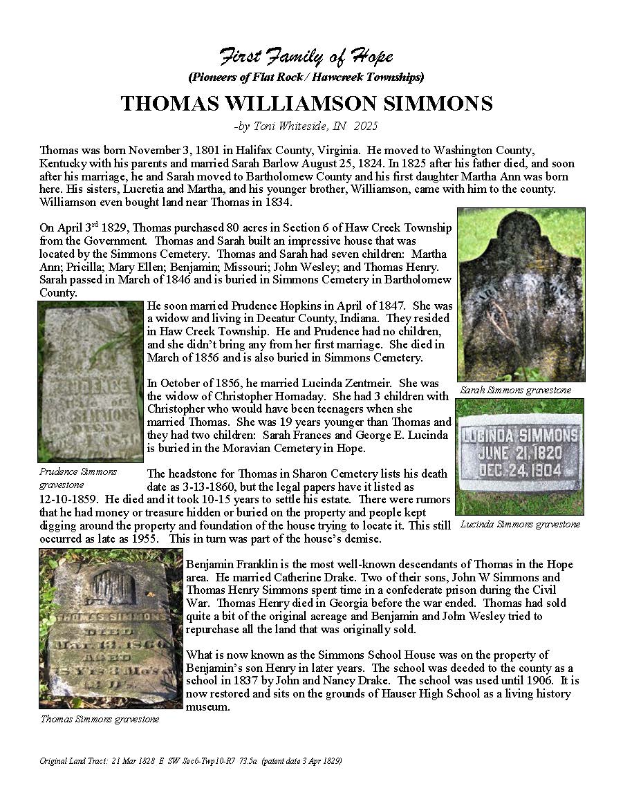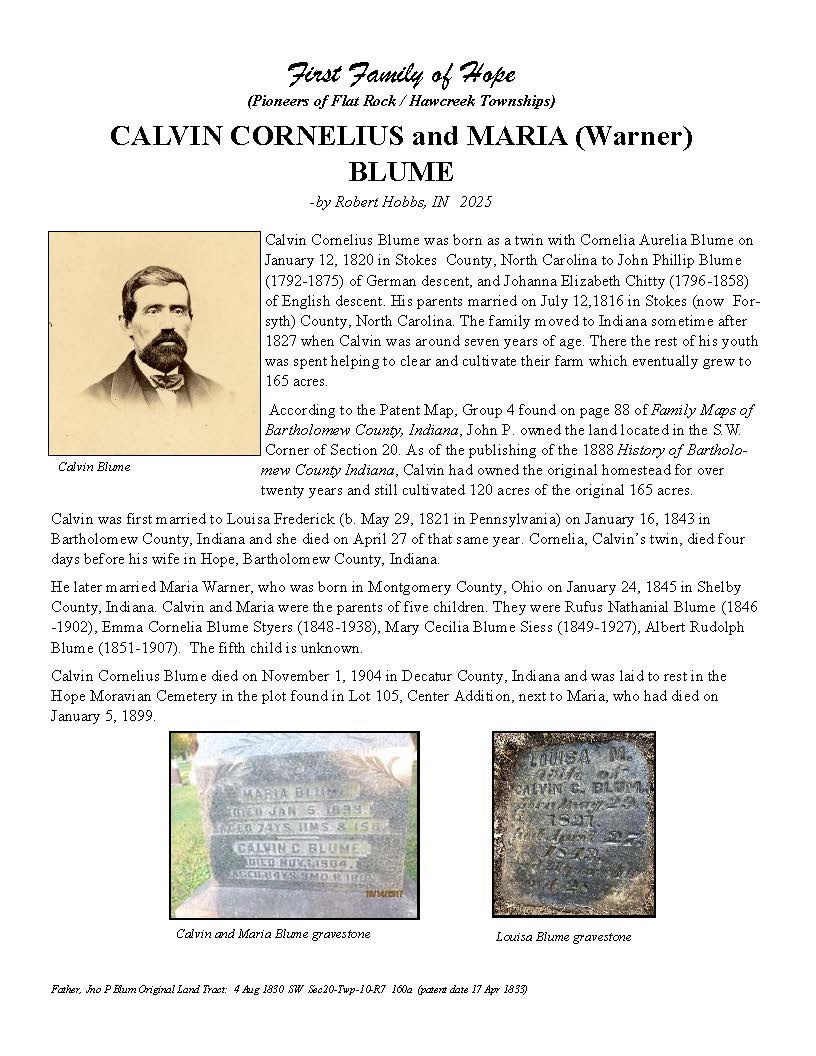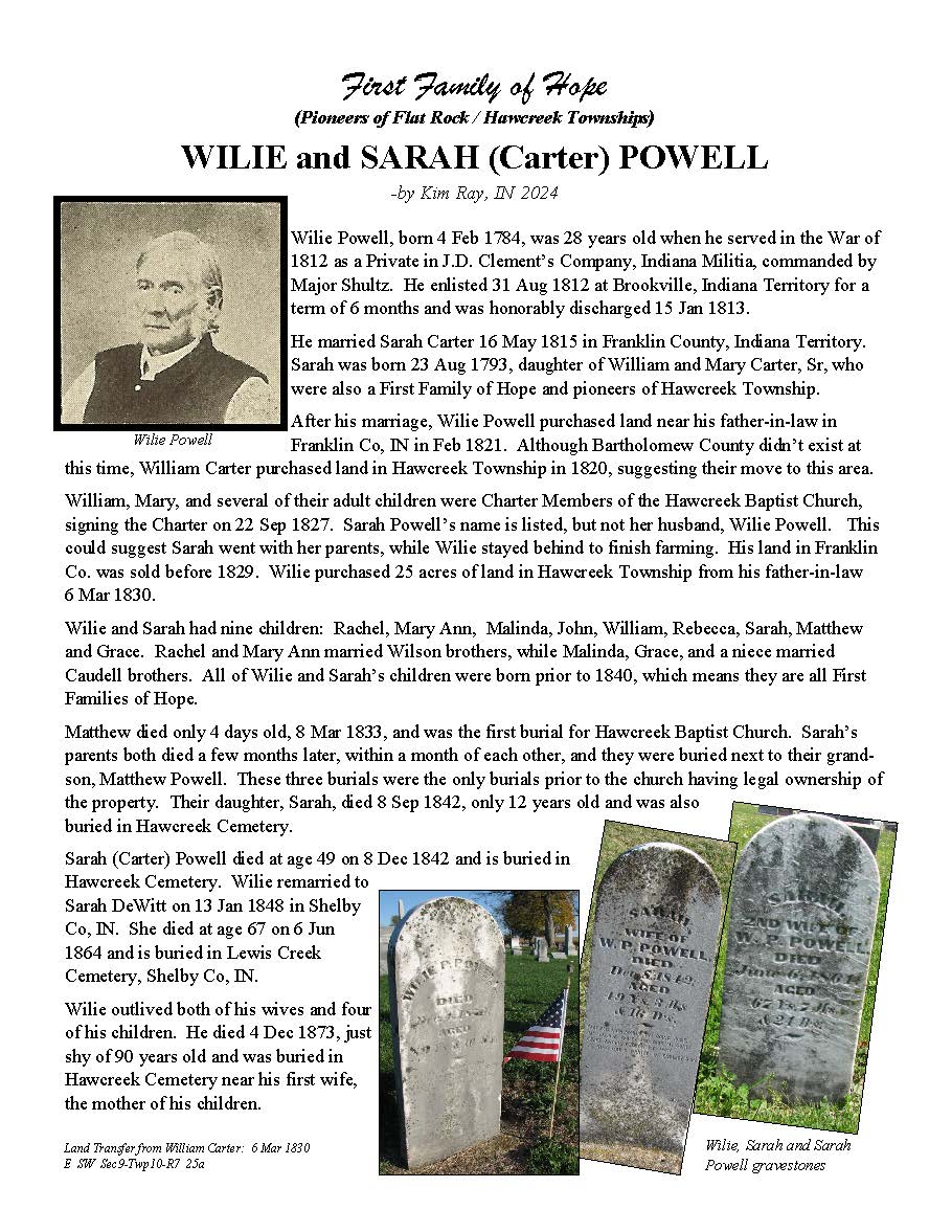 The Bartholomew County Genealogical Society created the First Families of Hope project to research, recognize, and honor 50 different surnames of the pioneers who were in Hawcreek or Flat Rock Township by 1840, as a gift to the Yellow Trail Museum in recognition of their 50th Anniversary – September 2025.