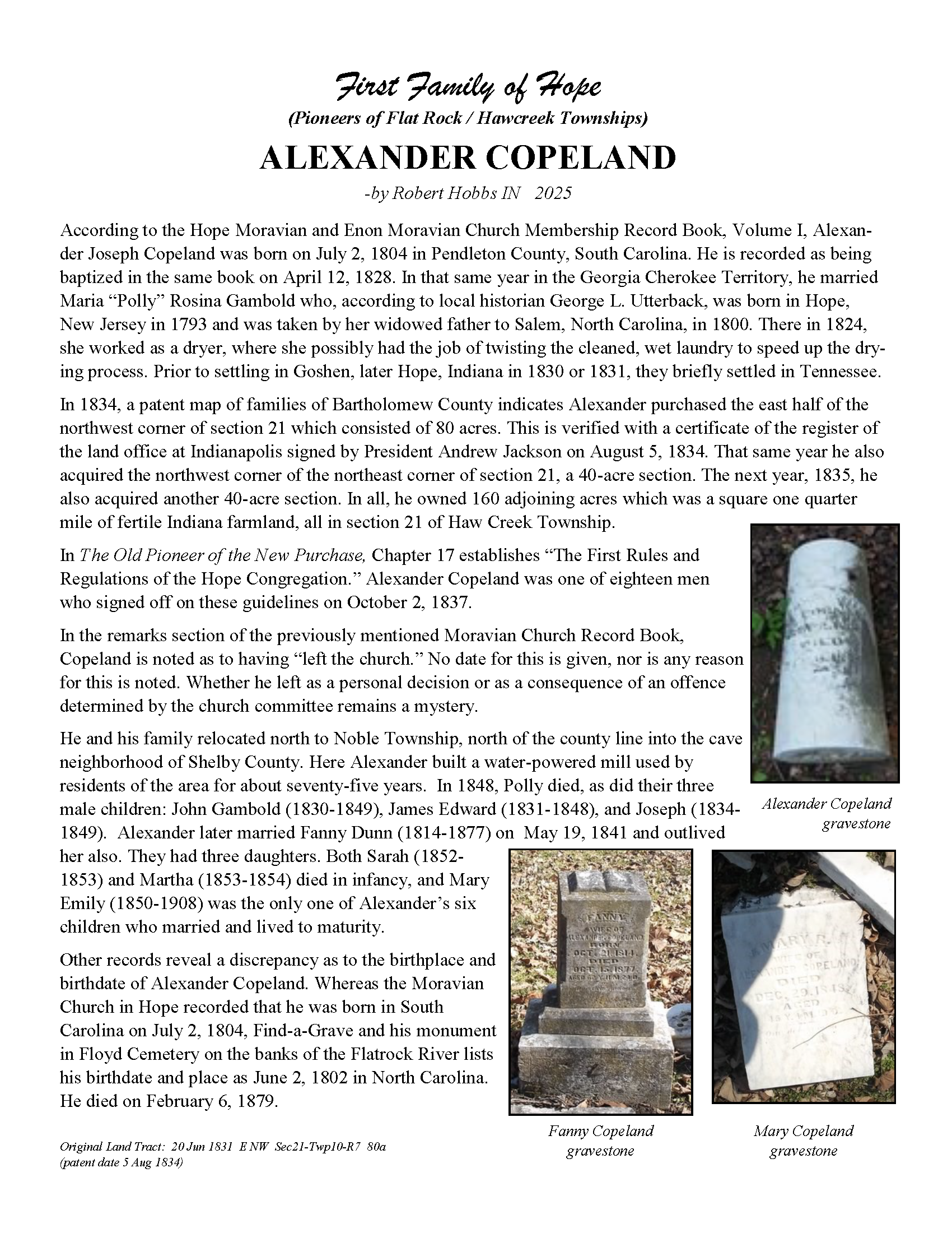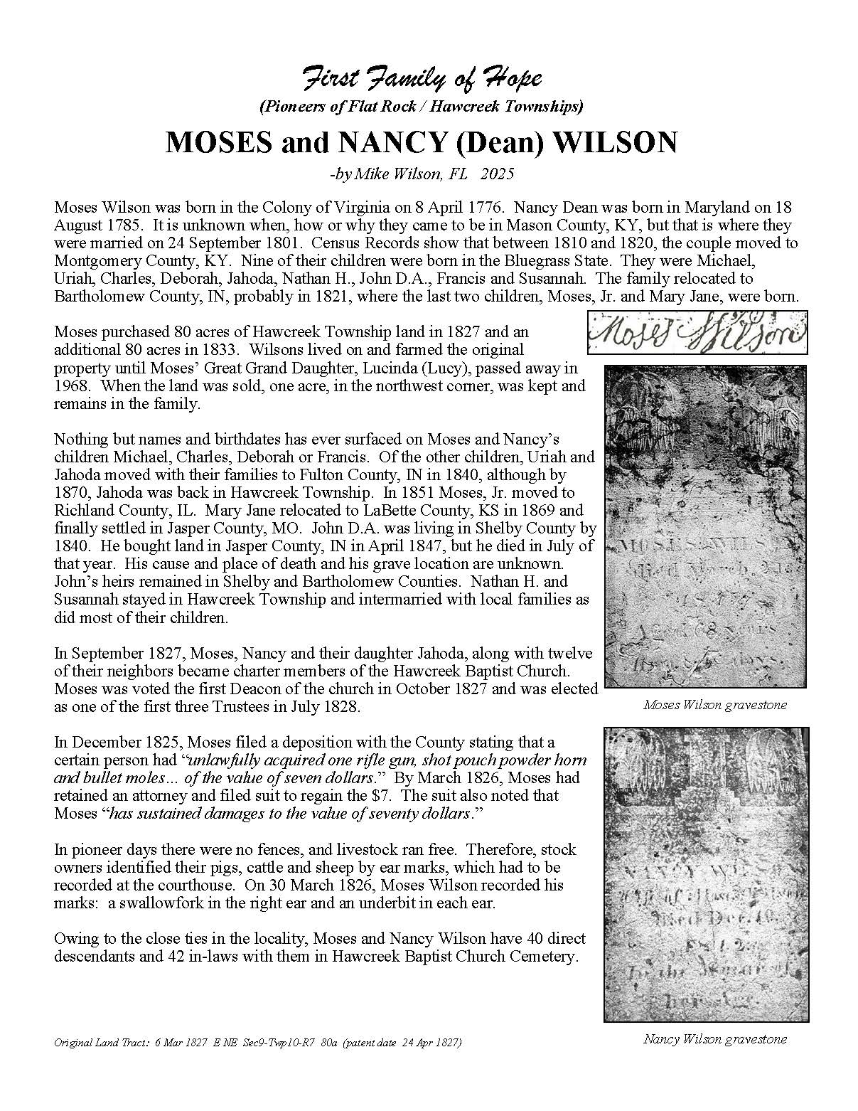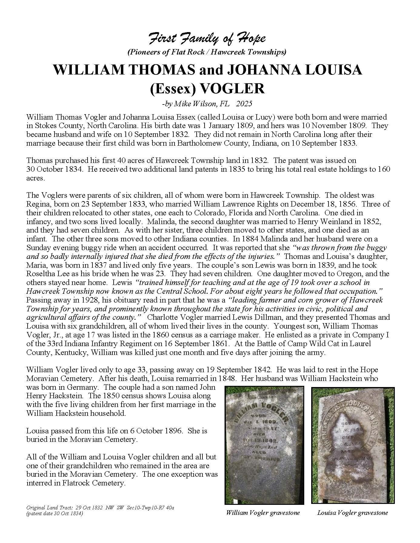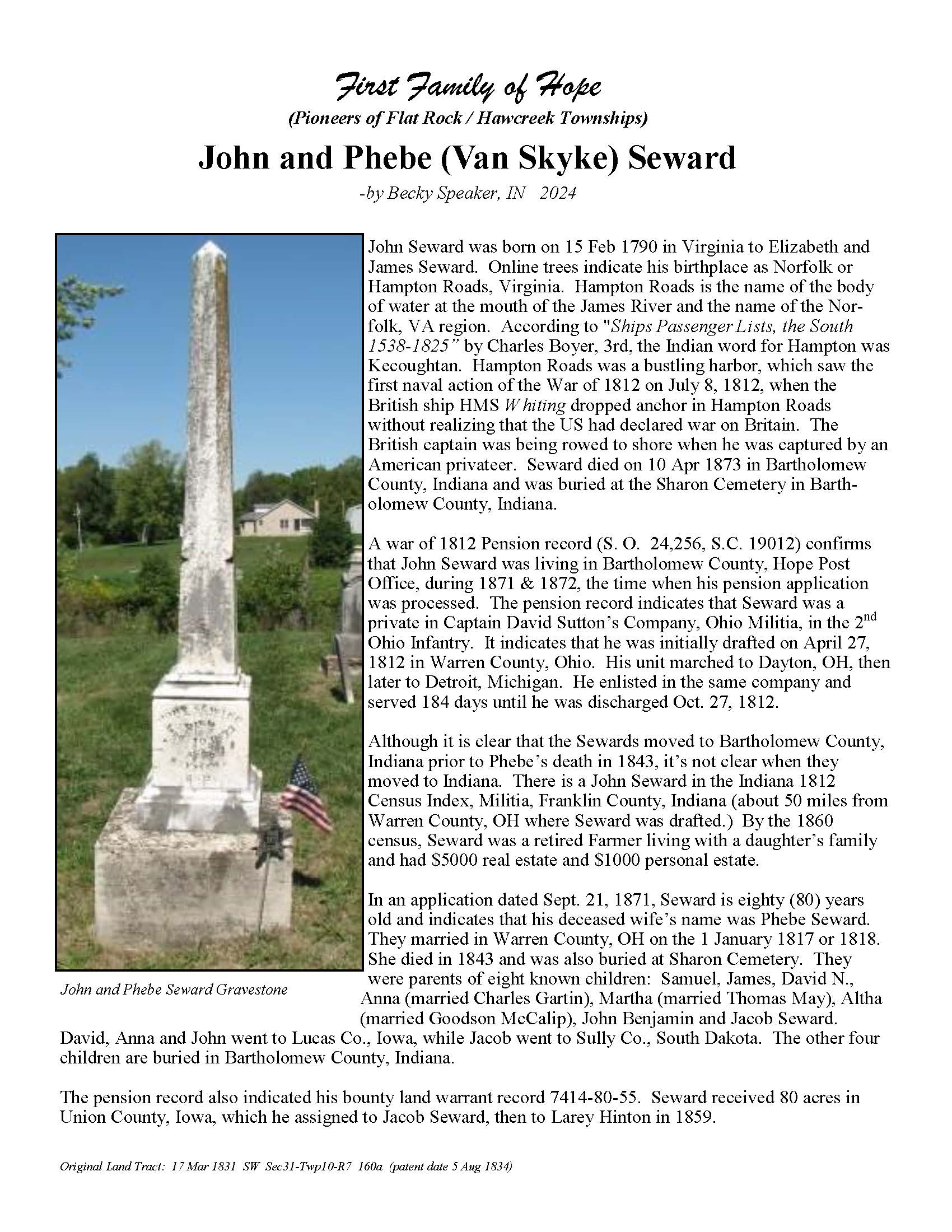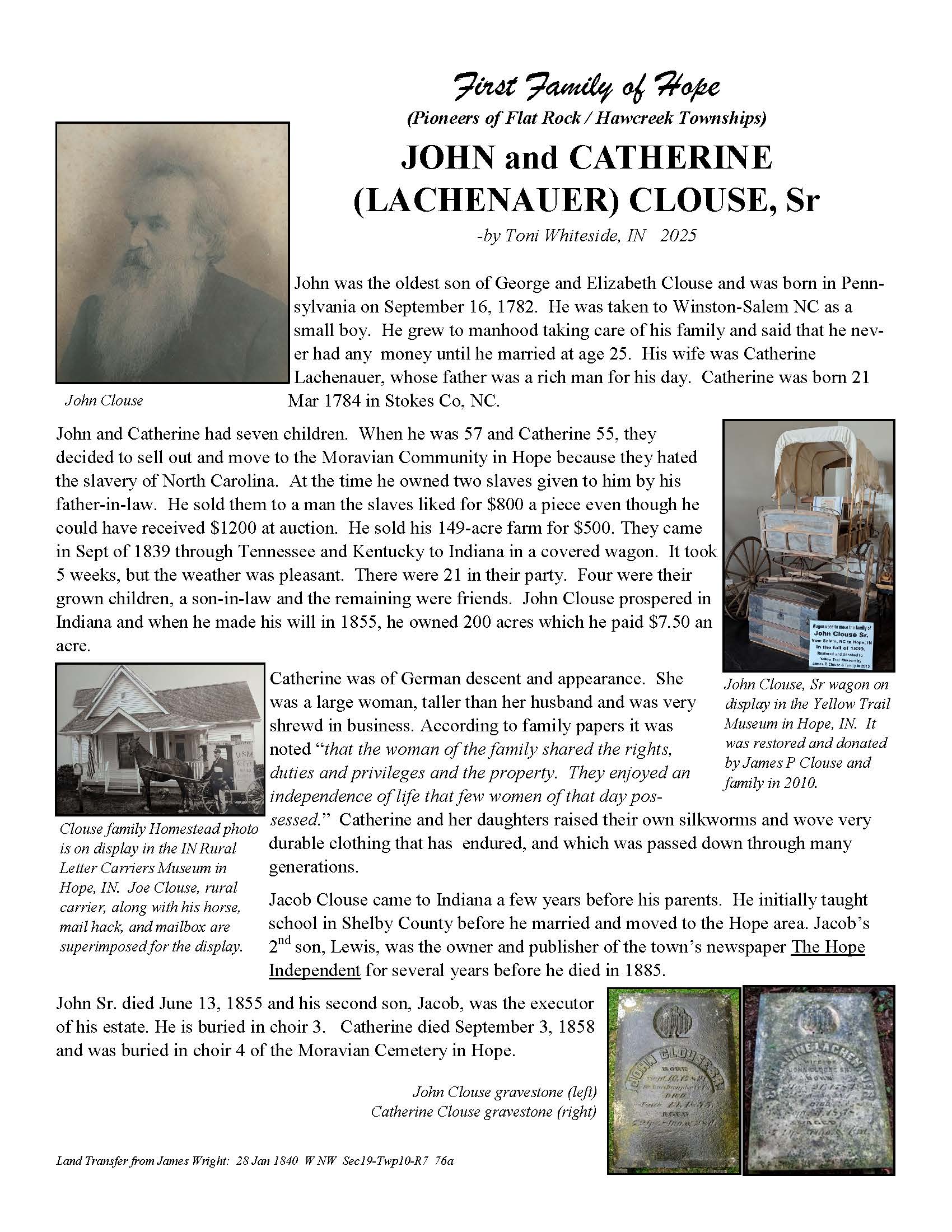 The Bartholomew County Genealogical Society created the First Families of Hope project to research, recognize, and honor 50 different surnames of the pioneers who were in Hawcreek or Flat Rock Township by 1840, as a gift to the Yellow Trail Museum in recognition of their 50th Anniversary – September 2025.