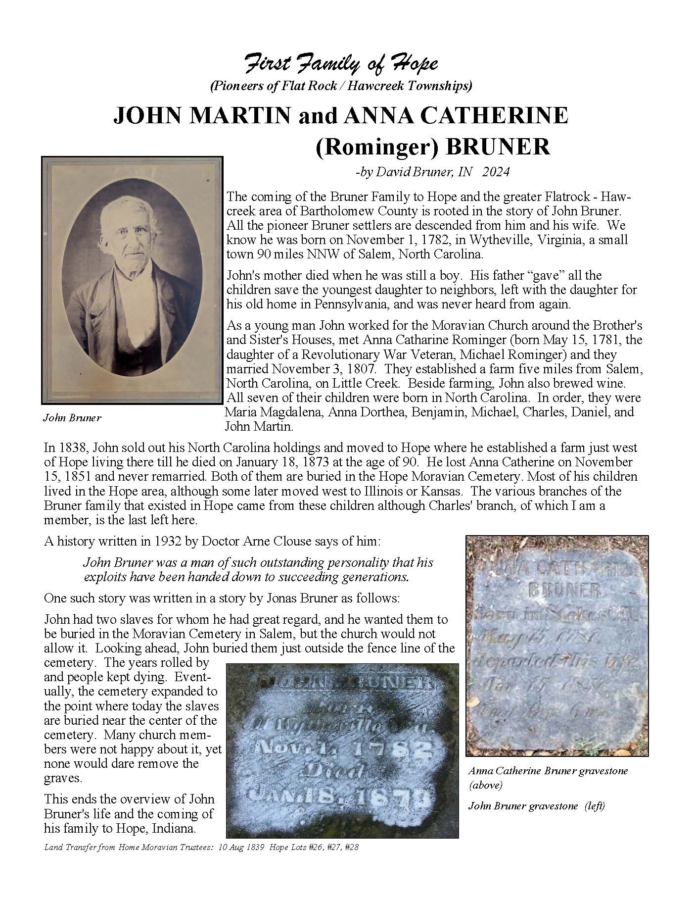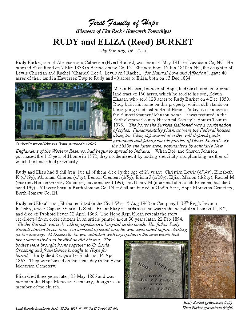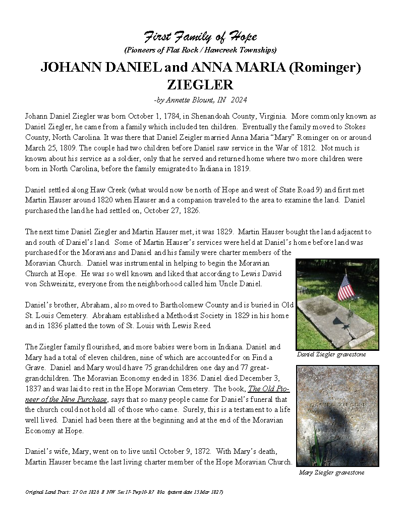 The Bartholomew County Genealogical Society would like to recognize the Yellow Trail Museum’s 50th Anniversary in 2025 with something involving the First Families in the Hawcreek / Flatrock area. We are inviting the public to participate in our gathering of information phase – The First Families of Hope Talks. Group 1, families who attended the first Moravian Church Service 17 Jun 1830, were held in previous First Families Talks from Feb – Aug 2024.